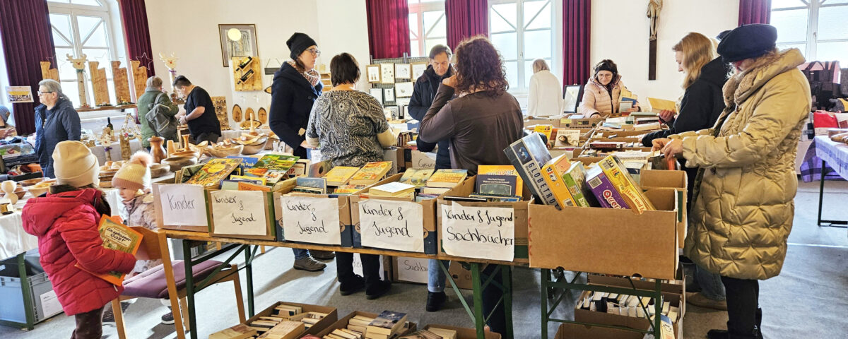 Im Pfarrsaal könnt ihr von 9:00 bis 18:00 Uhr in den zahlreichen Bücherkisten stöbern. Buchspenden werden gerne während der Öffnungszeiten in der Bücherei entgegengenommen.