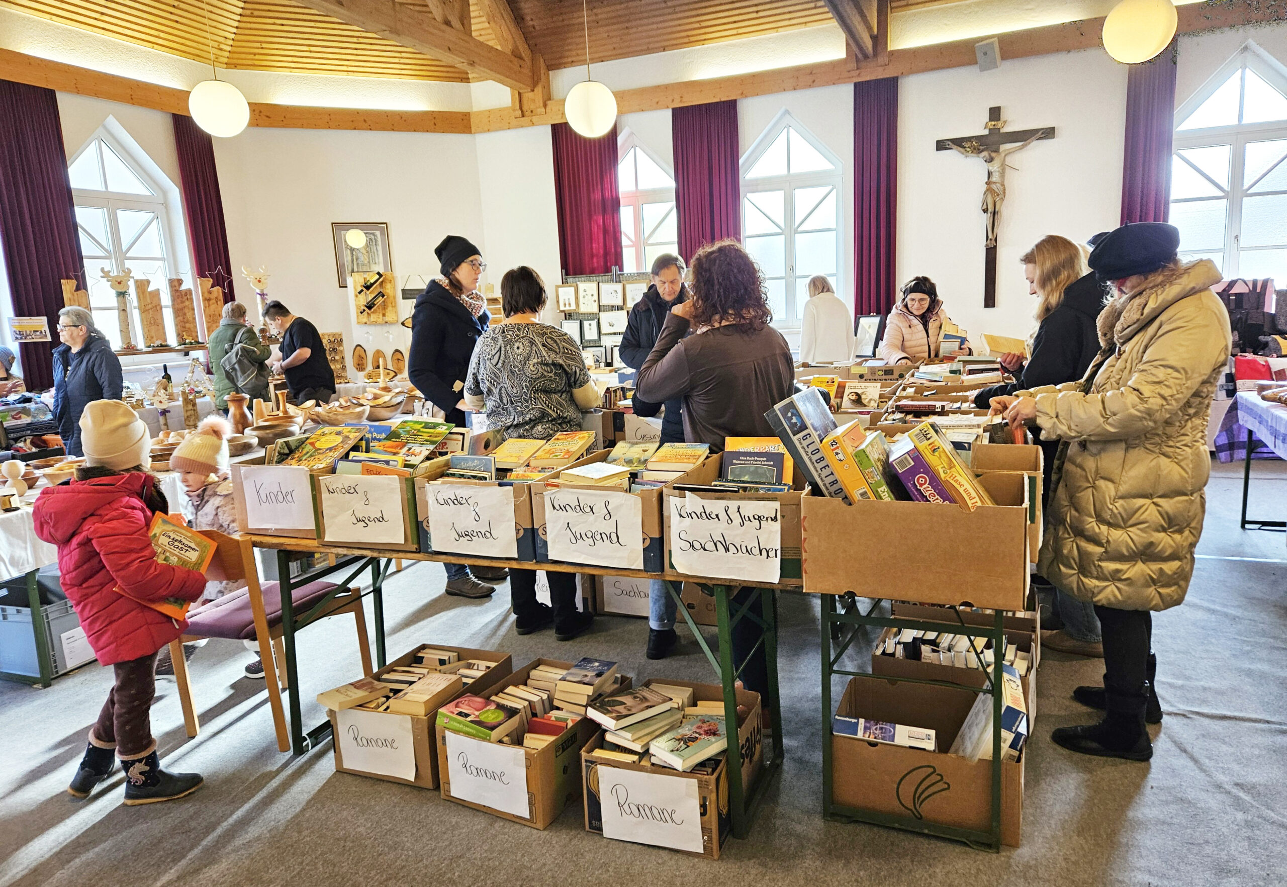 Im Pfarrsaal könnt ihr von 9:00 bis 18:00 Uhr in den zahlreichen Bücherkisten stöbern. Buchspenden werden gerne während der Öffnungszeiten in der Bücherei entgegengenommen.